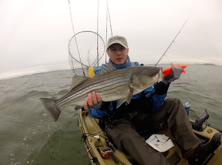 Sunday we stayed closer to Crisfield and the alarm buzzed again at 4:45. Still running on limited sleep, our crew launched while it was still dark. Lines were in right at 6AM and we all knew we still had a shot to place in the tournament since not many fish had been caught the day before. Lot and lots of small fish were caught. Small stripers were everywhere, but they were getting bigger. Multiple 19" fish were caught by our group but we couldn't find any 20"+ keepers. Finally I caught a legal Speck at 16.5" and I knew all I needed was one more fish to be in the running with an aggregate 3 fish limit. Dave and I fished hard until close to noon when we were planning to get off the water. As we fished our way back to the ramp I finally got a solid hit that felt like a better trout. The long slow pulls of the bait caster's drag was a tell tale sign. As I got it closer to the Hobie, I could see it was a decent sized Speck. Not huge but certainly better than what we were catching the last two days. It circled under the kayak a few times before I finally netted it and brought it into the yak. It measured out at 18.75" which was just enough to beat the 18.5" Speck caught by Gary.